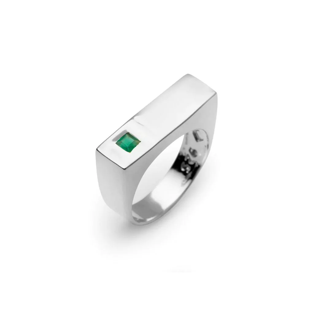 A força e elegância dessa peça ficam marcadas também nos ângulos retos. Seu design é moderno, e permite várias combinações nas mais diversas produções, desde básicas até as mais elaboradas. O carre de Crisioprásio, pedra preciosa verde, de tom escuro, pontua sem excessos a sofisticação da coleção.