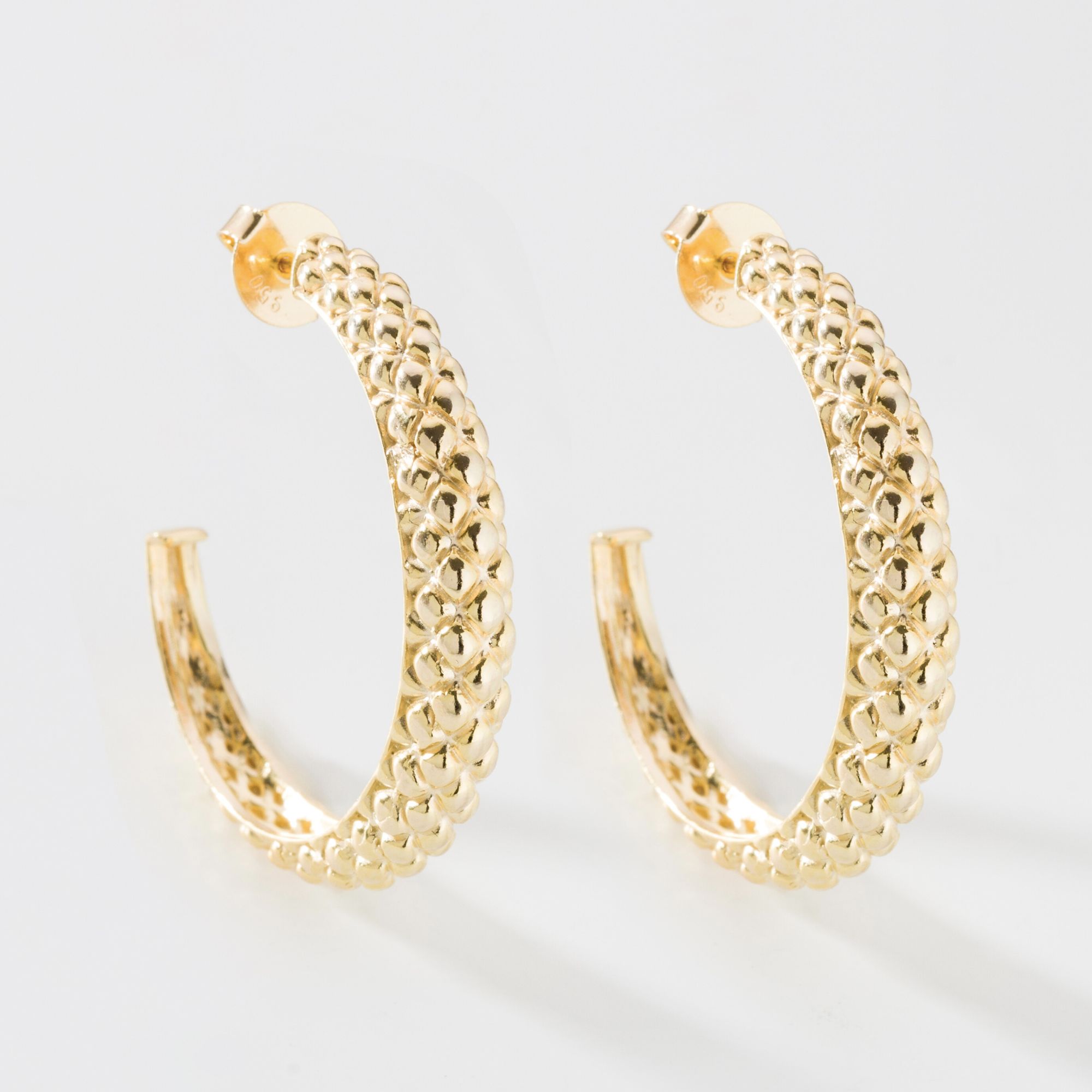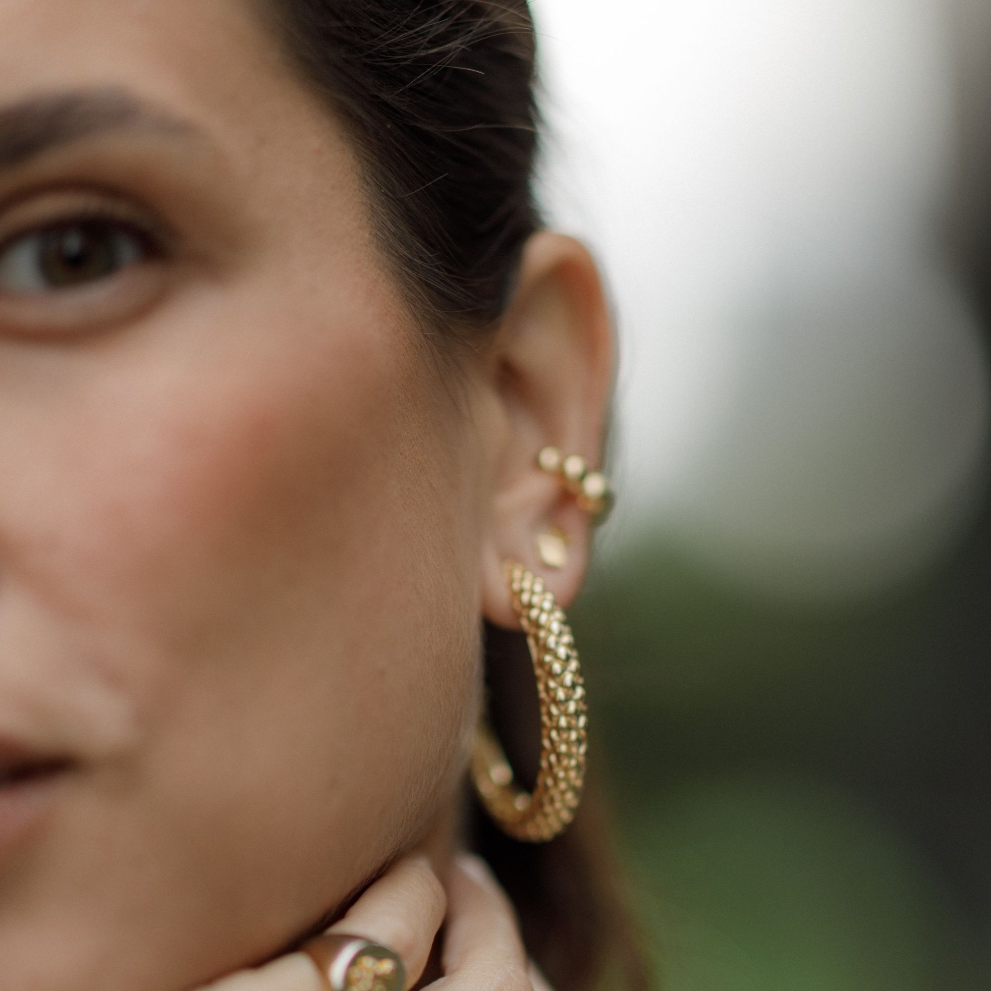 Todas as nossas peças douradas recebem uma espessa camada de Ouro 18K (10 milésimos) e as prateadas uma camada de Ródio. Ambos metais nobres que garantem cor, resistência e mais brilho às joias.
