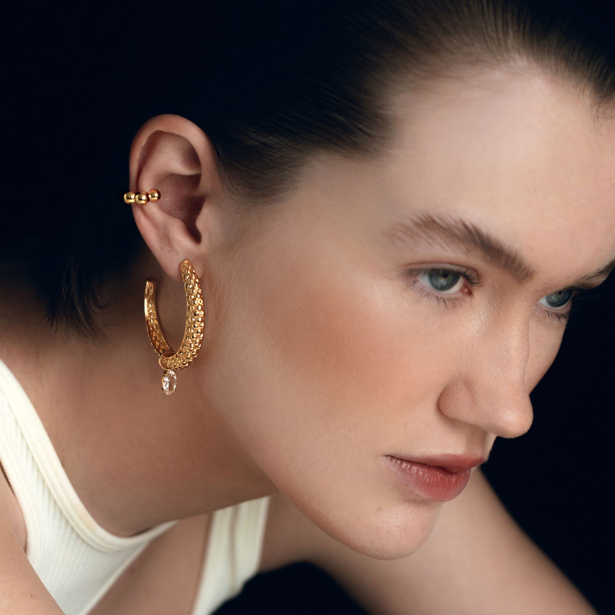 Inspiradas nas sutis obras-primas da natureza, as peças casulo exibem uma textura extraordinária e marcante. Representando as transformações silenciosas, os casulos simbolizam proteção, introspecção e metamorfose, e nos lembram da necessidade de pausar e renovar. É na reclusão dos casulos que a magia da mudança acontece, oculta do mundo externo. O topázio branco, esculpido em formato navete, reflete a luminosidade e a esperança que residem mesmo nos momentos mais introspectivos.